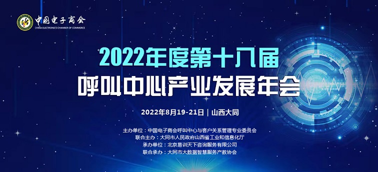 由中國電子商會(huì)呼叫中心與客戶關(guān)系管理專業(yè)委員會(huì)主辦,大同市人民政府、山西省工業(yè)和信息化廳聯(lián)合主辦,北京易訓(xùn)天下咨詢服務(wù)有限公司承辦,大同市大數(shù)據(jù)智慧服務(wù)產(chǎn)教協(xié)會(huì)聯(lián)合承辦的2022第十八屆呼叫中心產(chǎn)業(yè)發(fā)展年會(huì)將于8月20日在大同隆重舉辦! ... MORE>>